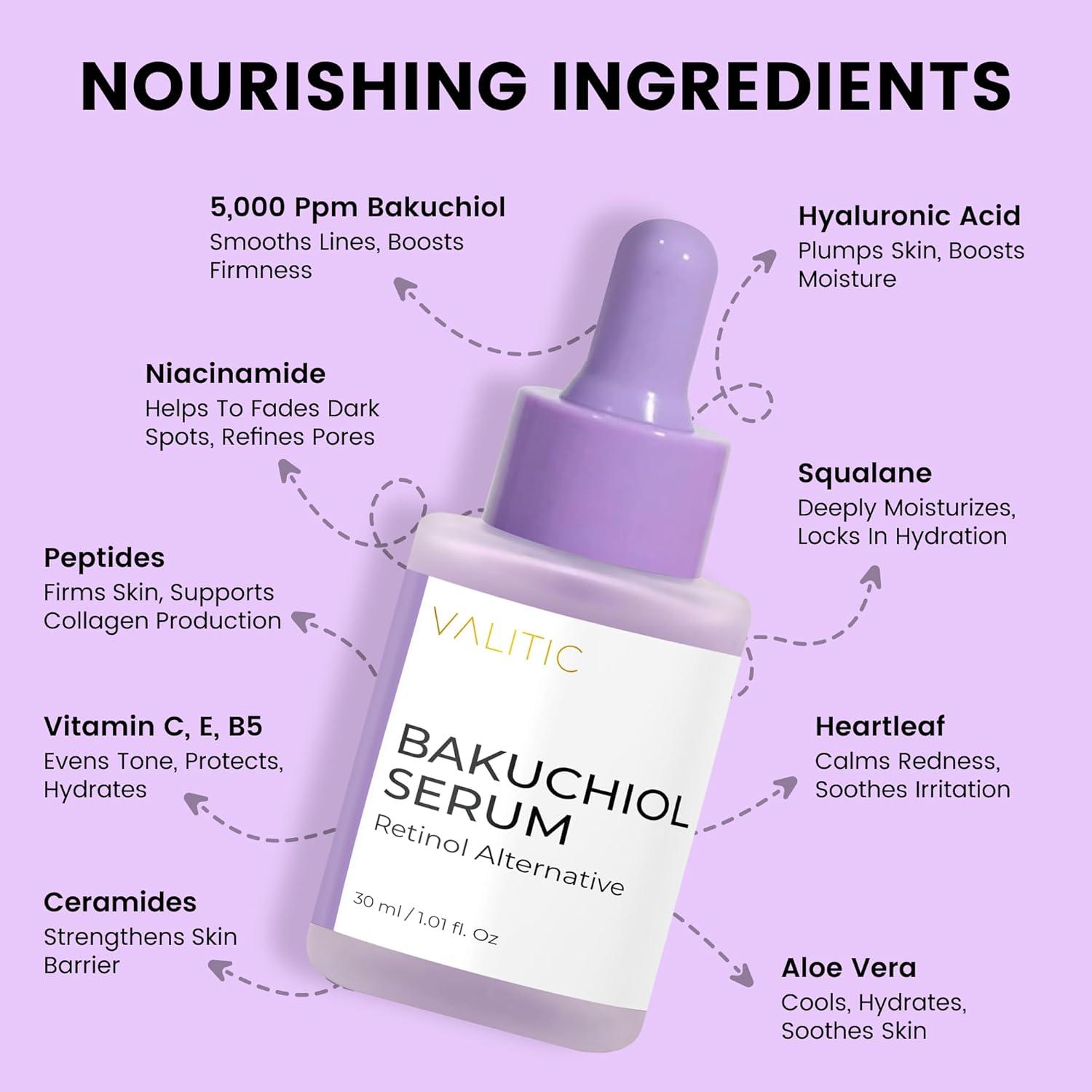 VALITIC Bakuchiol Serum - Retinol Alternative Face Serum - Facial Anti Aging Treatment, Hydrating and Evening Skin Tone - Niacinamide, Hyaluronic Acid, Peptides, Vitamin C, Squalane, 30ml 1.01 fl oz